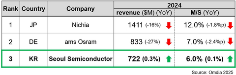 《2024年全球LED市场份额排名》(来源:Omdia)(图片:Seoul Semiconductor)