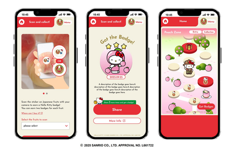 東京--(美國商業資訊)--日本青果物輸出促進協議會(J-FEC)再次與三麗鷗株式會社及其人氣角色Hello Kitty合作,推出互動式數位活動「Hello Kitty日本水果狩獵」。參加者可使用智慧型手機探索各種實體地點,如餐廳、零售商店、宣傳活動等,尋找其展示的官方「日本產果實」標章2。只要用智慧型手機掃描該標章,就能收集數位徽章,並與Hello Kitty一起參加尋寶遊戲,以獨特的互動方式發現日本水果的新鮮與魅力。